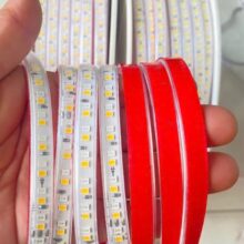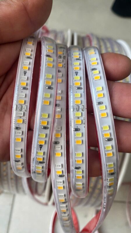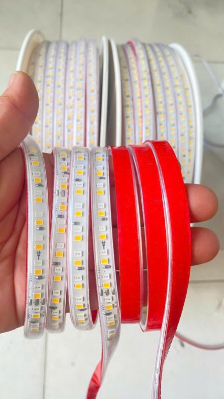 Băng keo 3M mặt sau của Đèn Led Dây 2835 192d 10mm 3 Chế Độ 220v Trắng Vàng=trung Tính dán chắc trên nhôm, nhựa và kính — lắp đặt sạch sẽ, không cần khoan đục.